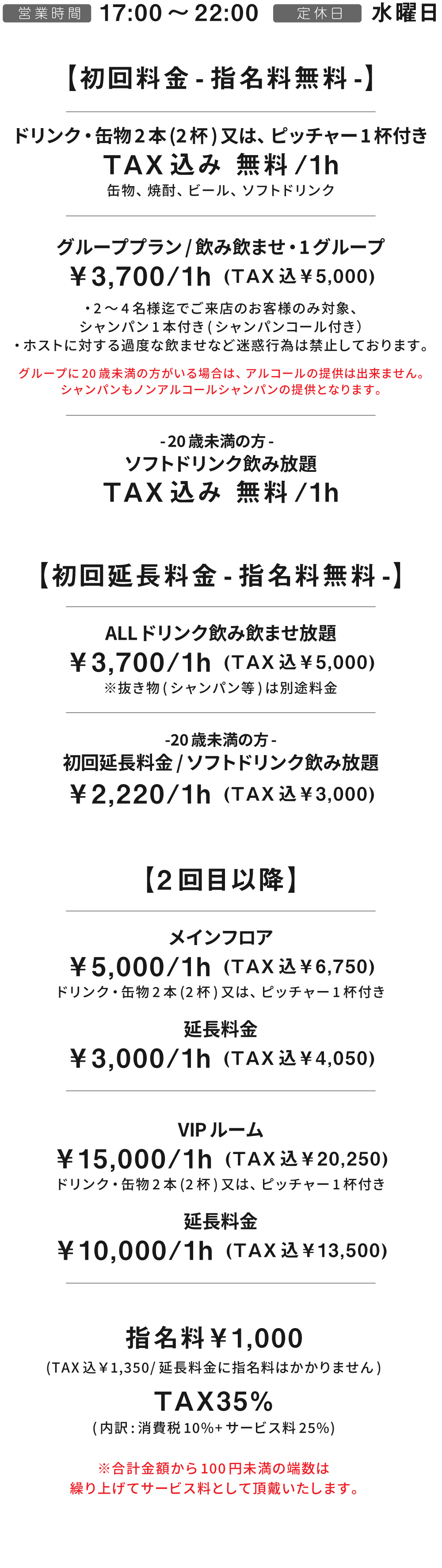 ※当グループでは、18歳未満・男性のお客様のご来店をお断りさせて頂いております。なお高校生の方もご来店いただけません。20歳未満の方へのお酒の提供も固くお断りしております。